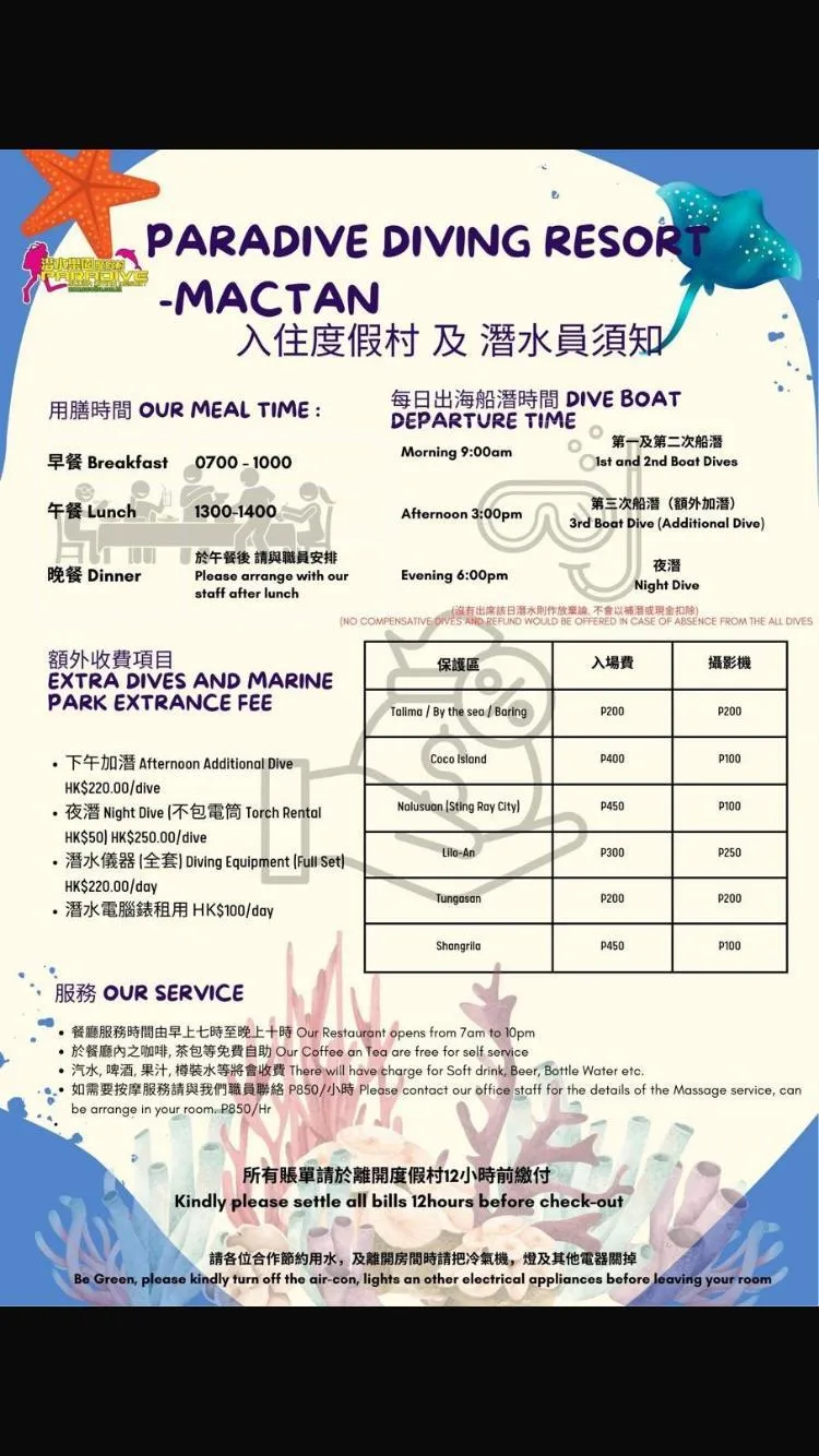 宿霧麥克坦度假村已為你準備好一切課程所需,NAUI潛水導師(華藉導師),課本及潛水儀器。快來到宿霧麥克坦潛水樂園度假村進入海洋世界,與你分享潛水心得